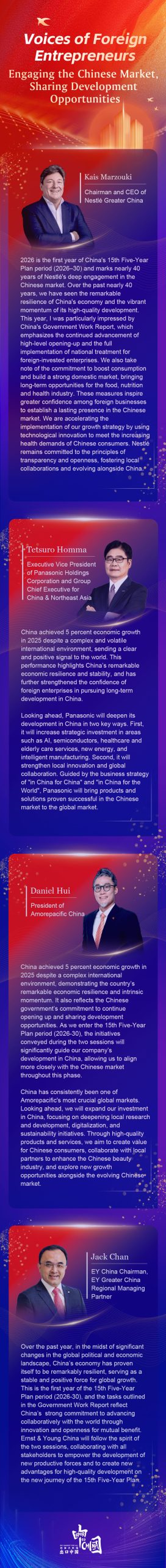 За чуждестранни предприятия в широк спектър от индустрии двете сесии предлагат важен прозорец към възможностите за развитие, свързани с Китай, и отразяват дълбоките им връзки с китайския пазар. Предоставените политически сигнали — като разширяване на отварянето, оптимизиране на бизнес средата и подкрепа на иновациите и индустриалното обновяване — засилиха тяхната увереност в дългосрочното развитие в Китай. Мнозина се изказаха високо за устойчивостта на китайската икономика и нейния искрен ангажимент за отвореност, отбелязвайки, че Китай остава един от най-важните пазари в света. Гледайки напред, чуждестранните предприятия планират допълнително да увеличат инвестициите в Китай, да подобрят местните научноизследователски и развойни дейности и бизнес инициативи, да ускорят локализацията на продуктите и иновациите в услугите и да допринесат за развитието на нови качествени производствени сили и висококачествен растеж, като същевременно проучват нови възможности за растеж заедно с развиващия се китайски пазар.