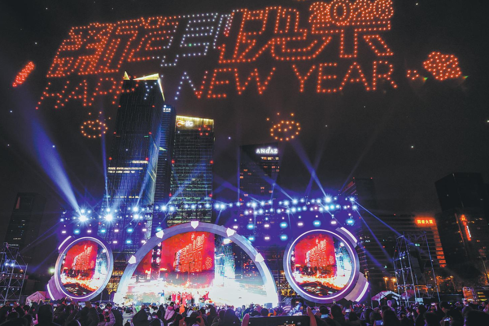 Хората се радват на шоу с дронове и посрещат новата година в бизнес район в Нанкин, провинция Дзянсу, на 31 декември. YANG BO/CHINA NEWS SERVICE