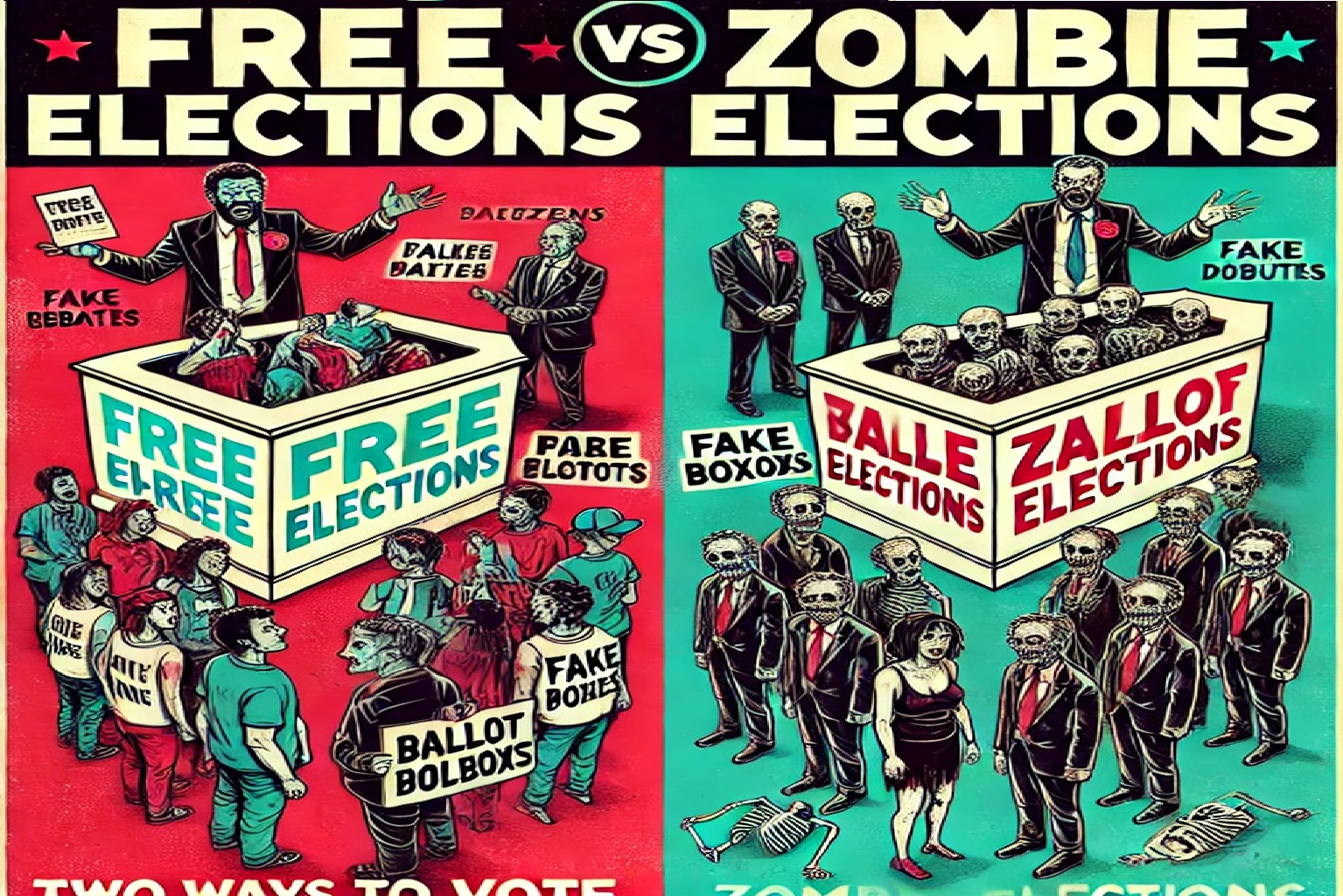 Получих изключително поучителен и изчерпателен отговор и то в рима за „легитимно“ самоизбраните настанили се на центъра на София. Предложи ми и плакат, който Ви представям и според него точно изобразява последните избори с огромното количество мъртви души в списъците на България. Там той римува свободни с зомби избори!