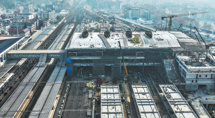 Въздушна снимка с дрон показва строителство на жп гара Liupanshui в Liupanshui, провинция Guizhou, на 11 декември. TAO LIANG/XINHUA
