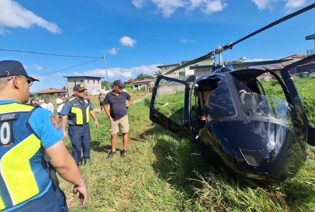 Полицейският служител на провинция Ризал Рамджае Панга каза, че убитите пътници са малайзиец и филипински. Останките от хеликоптер се виждат, след като прави принудително кацане в тревиста зона в град Пилила. Снимка: Полицейско управление на провинция Ризал