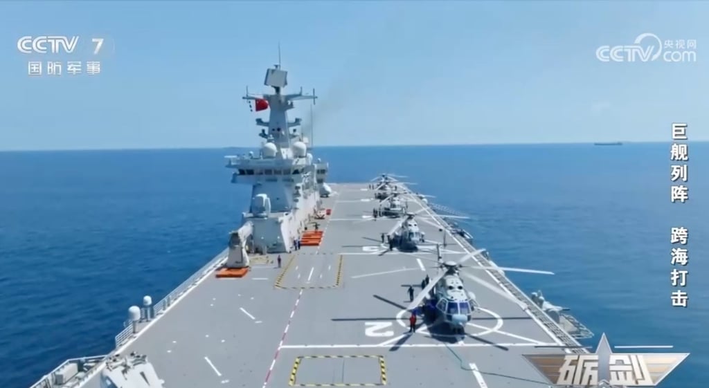 Това е първият път, когато подобен дрон е забелязан на десантно-десантен кораб тип 075. Снимка: CCTV