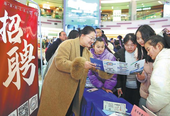 Служител от местното бюро за човешки ресурси и социално осигуряване представя политики за таланти на търсещите работа на панаир на труда в Лианюнганг, провинция Дзянсу, на 9 януари. Над 300 позиции бяха отворени за наемане. Zhu Huanan/За China Daily