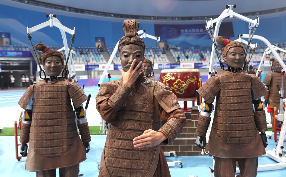 Роботи от танцовия спектакъл Soul of the Qin Terracotta Warriors заедно с Gong He (в средата), студент от Beijing Dance Academy, чакат да излязат на сцената преди церемонията по откриването на Световните игри на хуманоидните роботи през 2025 г. в Пекин през август. [Photo by Zou Hong/chinadaily.com.cn]