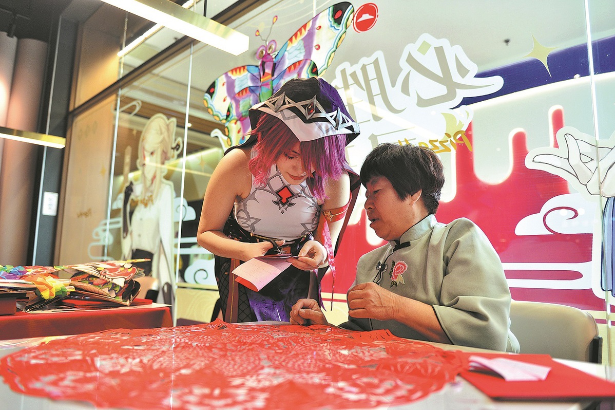 Хао Гуйфен (вдясно) напътства млад ентусиаст в техниките за рязане на хартия по време на дейност в Тиендзин през април 2023 г. HU LINGYUN/ЗА КИТАЙ ДАЙЛИ