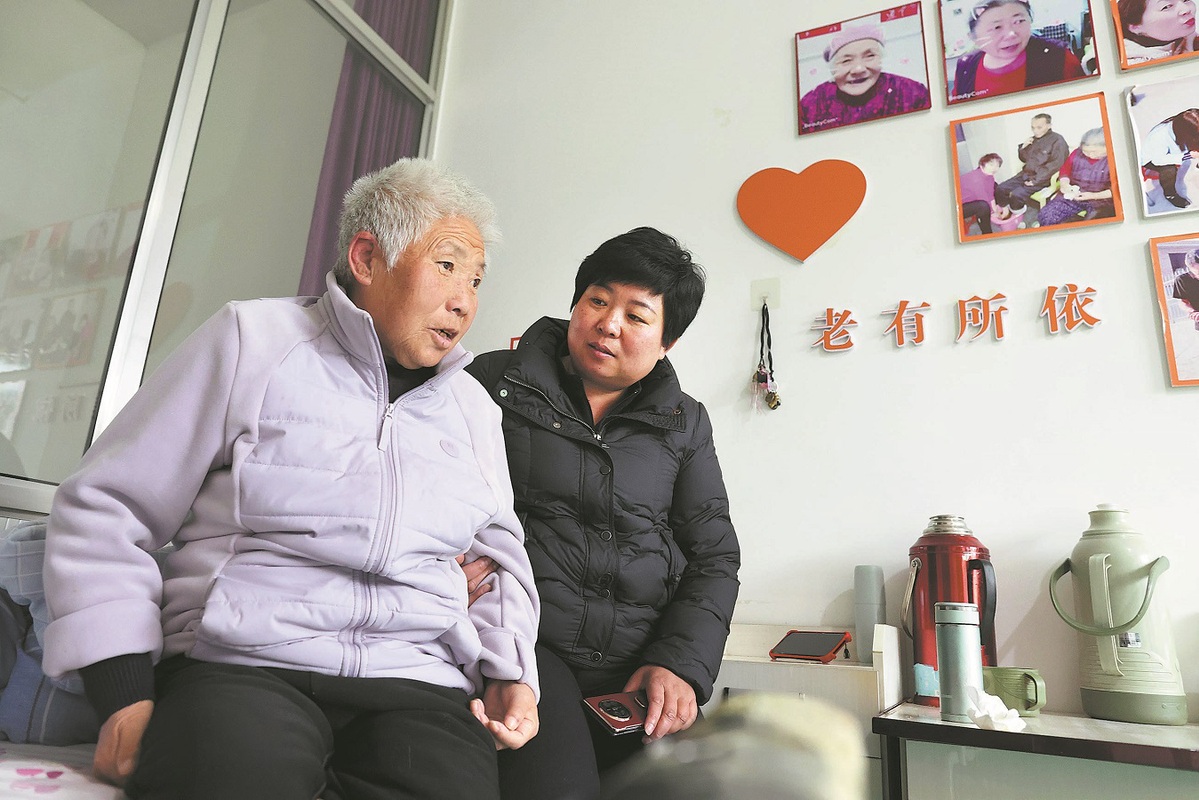 Ma Jinlian, заместник на NPC, разговаря с възрастен обитател в център за обслужване на възрастни хора в село Xiaocheng, град Lyuliang, провинция Shanxi, на 28 февруари. ZHU XINGXIN/CHINA DAILY