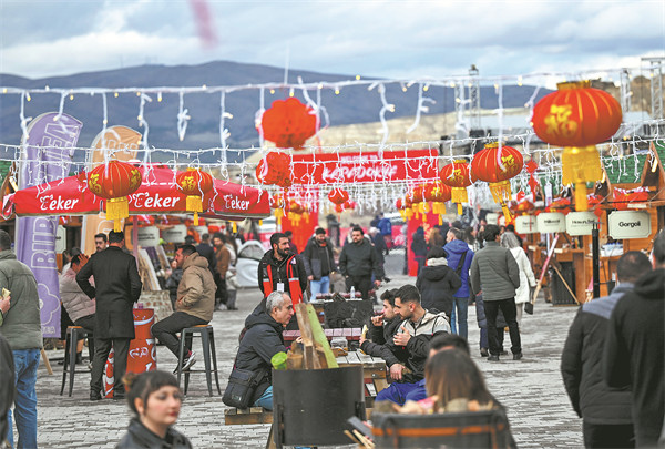 Посетители се разхождат по празнично украсена улица за храна в района на Кападокия в централна Турция на 14 февруари. LIU LEI/XINHUA