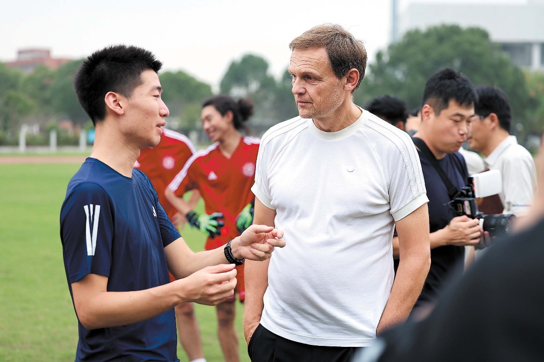 Главният изпълнителен директор на Adidas Global Bjorn Gulden общува със студент от Шанхайския университет Jiao Tong. КИТАЙ ДЕЙЛИ
