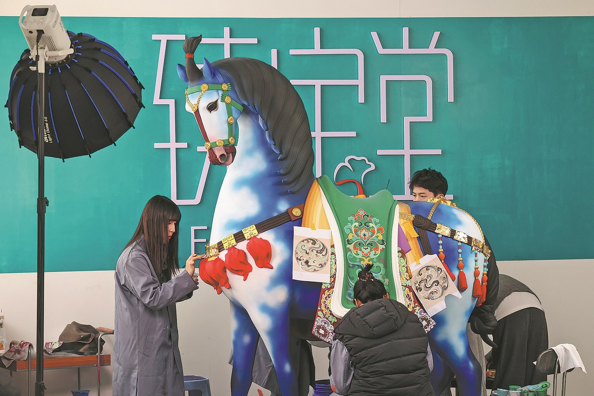 Студио Artisans of the Clay Figure Zhang рисува върху скулптура Година на коня в Тиендзин през февруари. СЪН ФАНЮЕ/СИНХУА