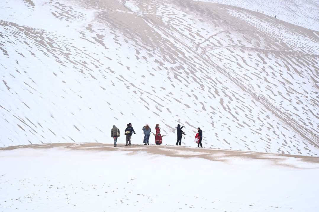 Туристи посещават планината Мингша и живописната зона на полумесеца в град Дунхуанг, северозападна китайска провинция Гансу, на 23 ноември 2025 г. Покрити със снежна покривка, добре познатите туристически атракции в Дунхуанг представят зашеметяващ зимен пейзаж. [Photo/Xinhua]