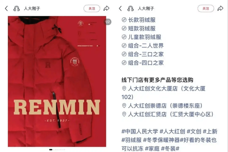 Серията също така включва пакетни пакети, брандирани като семейни комплекти „за двама“, „трима“ и „четирима“, заедно с три физически магазина в кампуса в Пекин. Цените са определени на 899 юана ($128) за дълги якета и 399 юана за къси стилове, налични в множество цветове. Якетата включват дебюта на подписа „Renda Red“. Купувачите включват основно студенти, преподаватели и възпитаници, като много възпитаници избират семейни пакети, съобщи Jimu News, че училището казва.