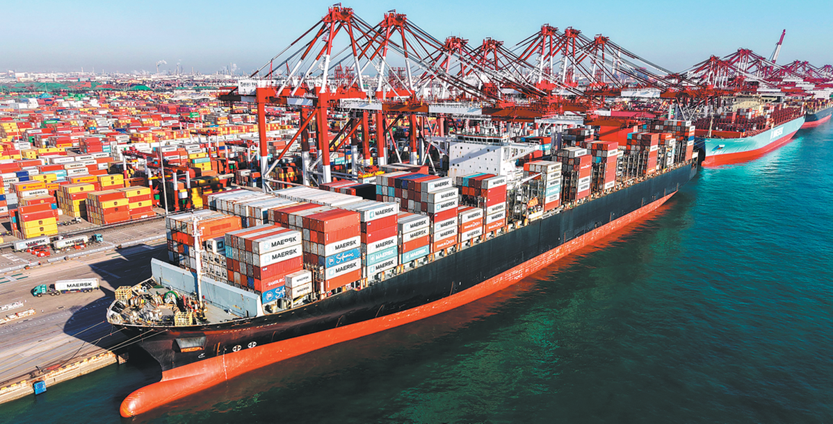 Контейнерни кораби се виждат акостирали на контейнерен терминал Qianwan в Кингдао, провинция Шандонг, на 8 декември. YU FANGPING/ЗА КИТАЙ ДАЙЛИ