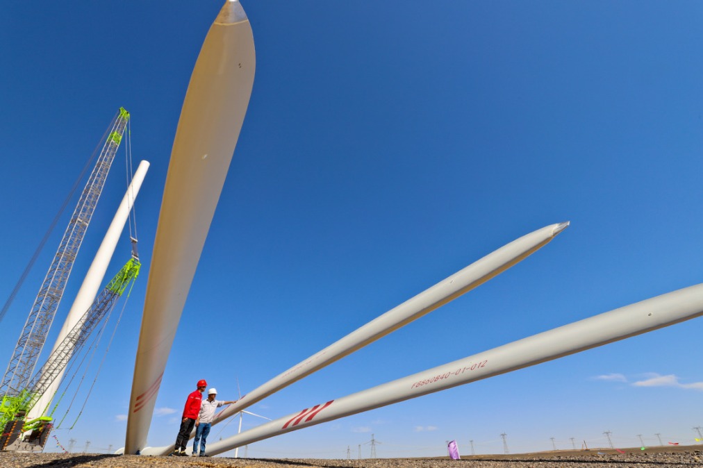 Техници инспектират лопатки на вятърни турбини на строителна площадка в Zhangye, северозападна китайска провинция Гансу, на 7 септември. [WANG JIANG/FOR CHINA DAILY]