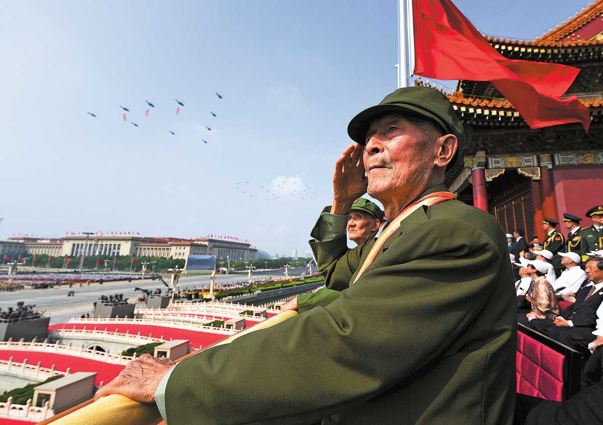 Ветеран поздравява на трибуната Tian“anmen преди военния парад в Пекин на 3 септември. Китай проведе грандиозно събиране, за да отбележи 80-ата годишнина от победата в Китайската народна война за съпротива срещу японската агресия (1931-45) и Световната антифашистка война. CAI YANG/XINHUA
