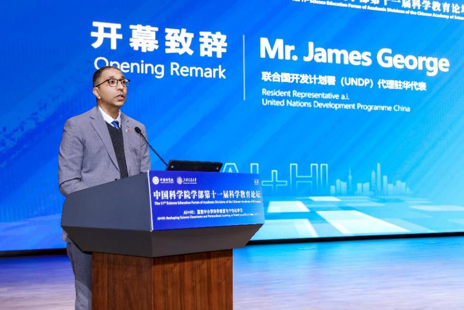 Джеймс Джордж, представител на Програмата за развитие на ООН, говори на церемонията по откриването на 11-ия форум за научно образование на академичните отдели на Китайската академия на науките, проведен в Шанхай във вторник. [Provided to chinadaily.com.cn]