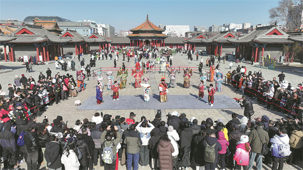 Туристи гледат традиционно представление на Пекинската опера на площада по протежение на императорския дворец Шенян в Шенян, провинция Ляонин, на 17 февруари. Градът, някога известен предимно като индустриален град, сега се превърна в процъфтяваща туристическа дестинация. ЧЖАН УЕНКУЙ/ЗА КИТАЙ ДАЙЛИ