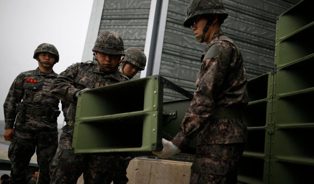 Южнокорейските войници демонтират високоговорители, които бяха създадени за пропагандни излъчвания в близост до демилитаризираната зона, разделящи двете Кореи в Паджу. Снимка: AFP