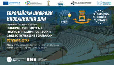 Община Пловдив и Европейският цифров иновационен хъб „Тракия“ имат удоволствието да Ви поканят на Европейски цифрови иновационни дни в критичната инфраструктура “Киберсигурността в индустриалния сектор и съществуващите заплахи” по проекта “Cyber4AllSTAR”, които ще се проведат на 29.05.2025 в DoubleTree by Hilton Plovdiv Center и на 30.05.2025 г. в офиса на ЕЦИХ „Тракия“ в Пловдив и онлайн.