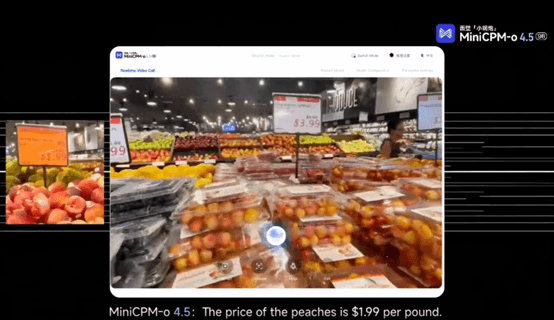 При демонстрации на живо MiniCPM-o4.5 може да поеме инициативата, без да бъде подканен. Когато въздушният фритюрник приключи с готвенето и издаде звуков сигнал, моделът проактивно съобщава, че нагряването е приключило. Докато пазарувате в супермаркет, той непрекъснато проследява смяната на рафтовете и отговаря на запитвания за цени в реално време. В асансьорите той разпознава промените на пода и предупреждава потребителите при достигане на местоназначението им.